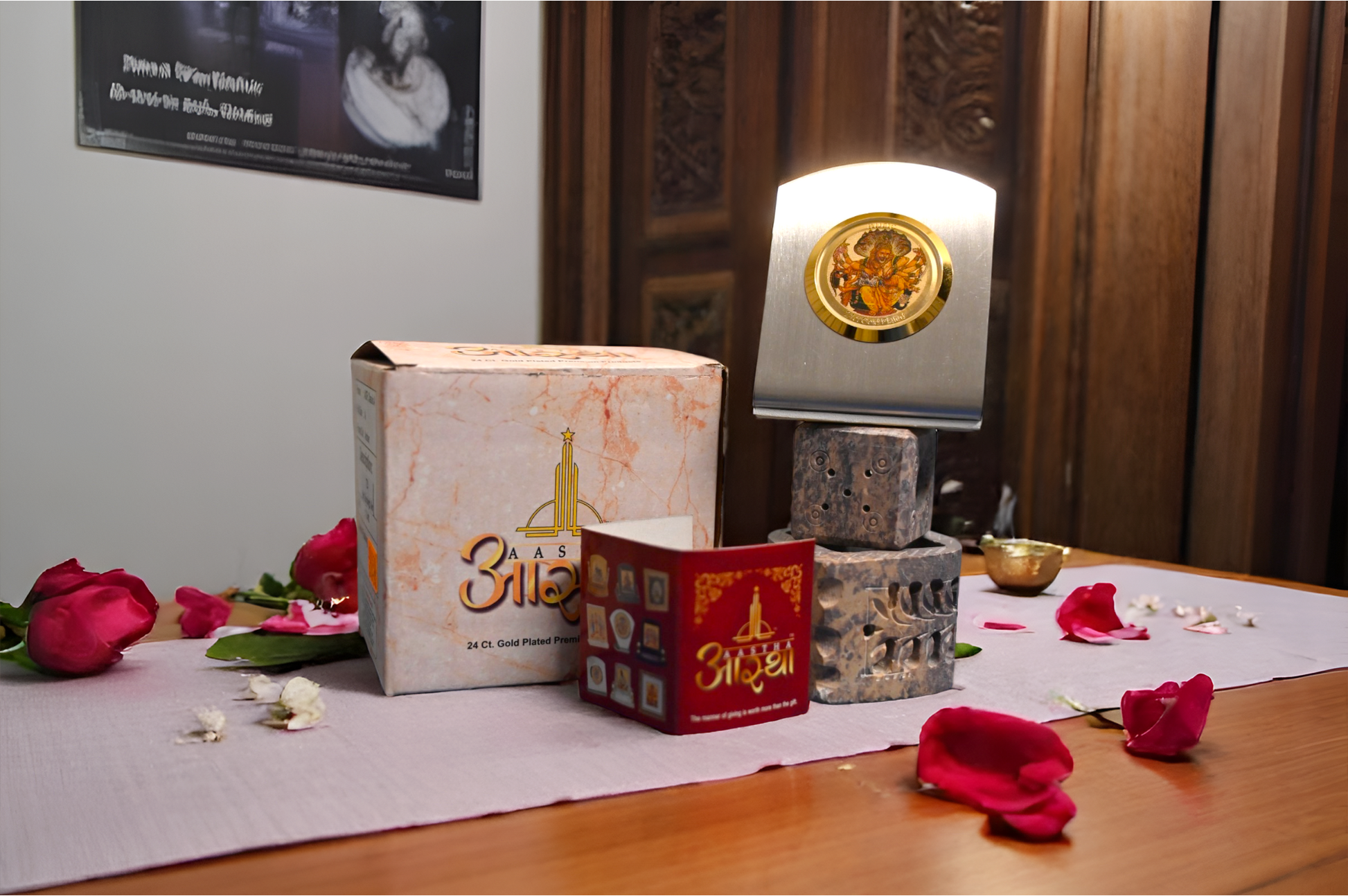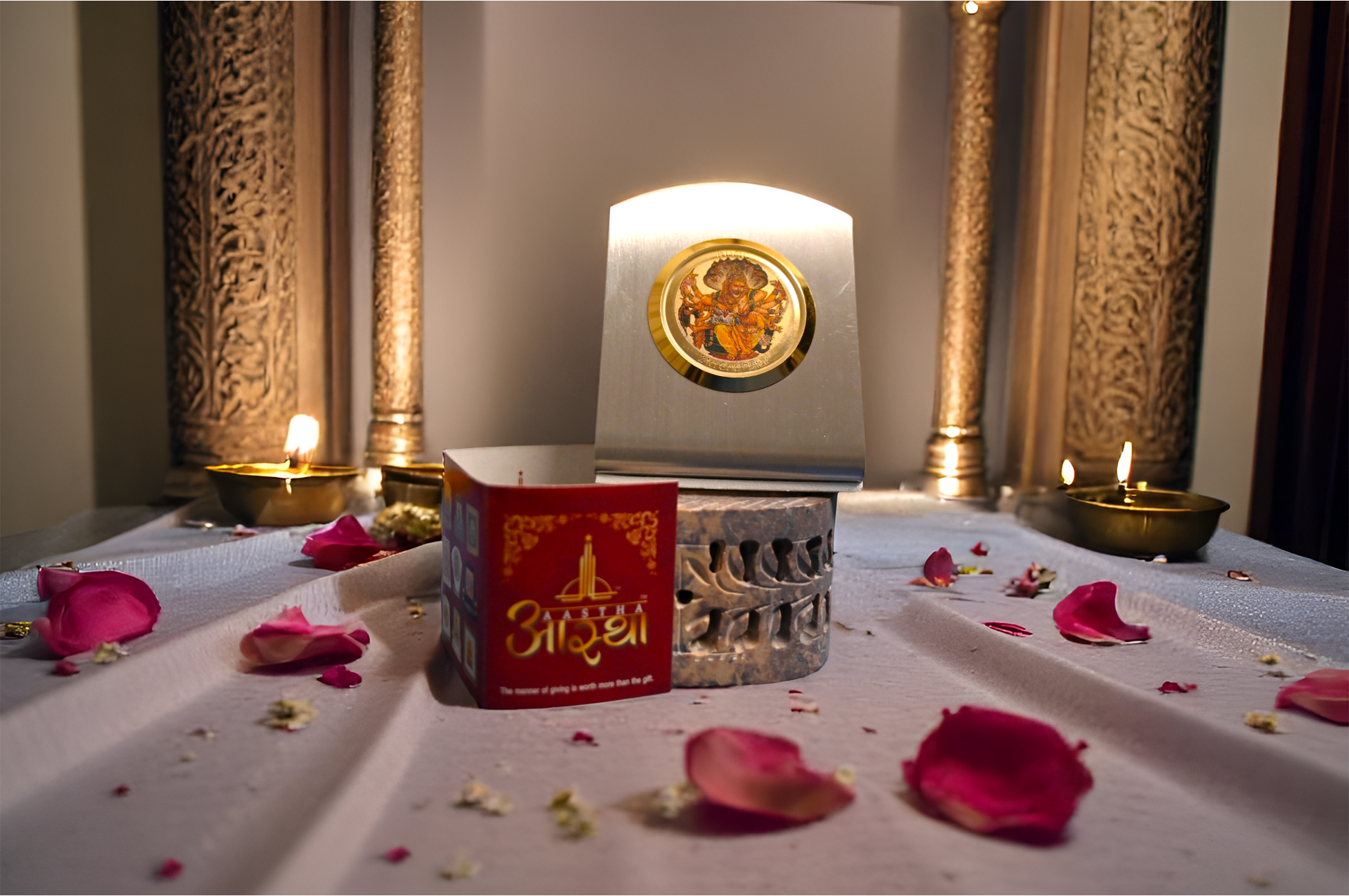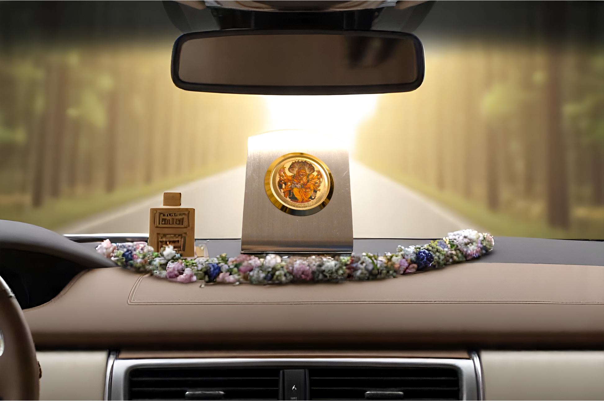 A beautifully crafted 24-carat gold-plated car dashboard frame, designed to bring divine presence and blessings to every journey. Elegantly finished for a premium look, it serves as both a spiritual symbol and a protective charm during travel.
