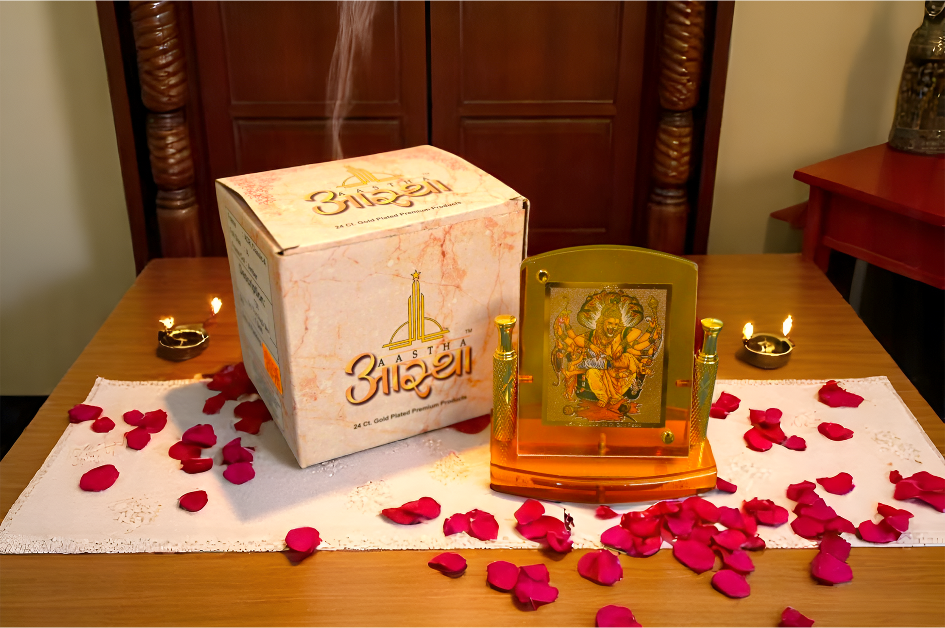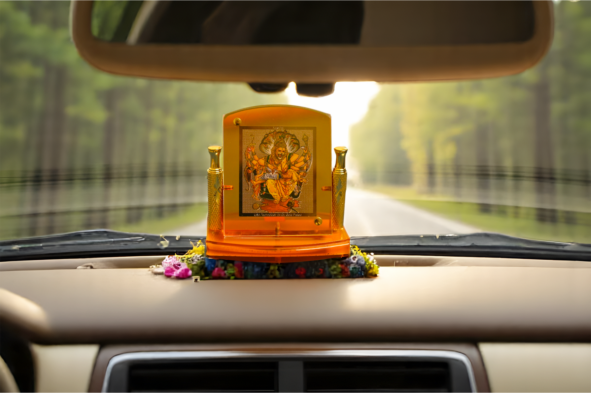 A beautifully crafted 24-carat gold-plated car dashboard frame, designed to bring divine presence and blessings to every journey. Elegantly finished for a premium look, it serves as both a spiritual symbol and a protective charm during travel.