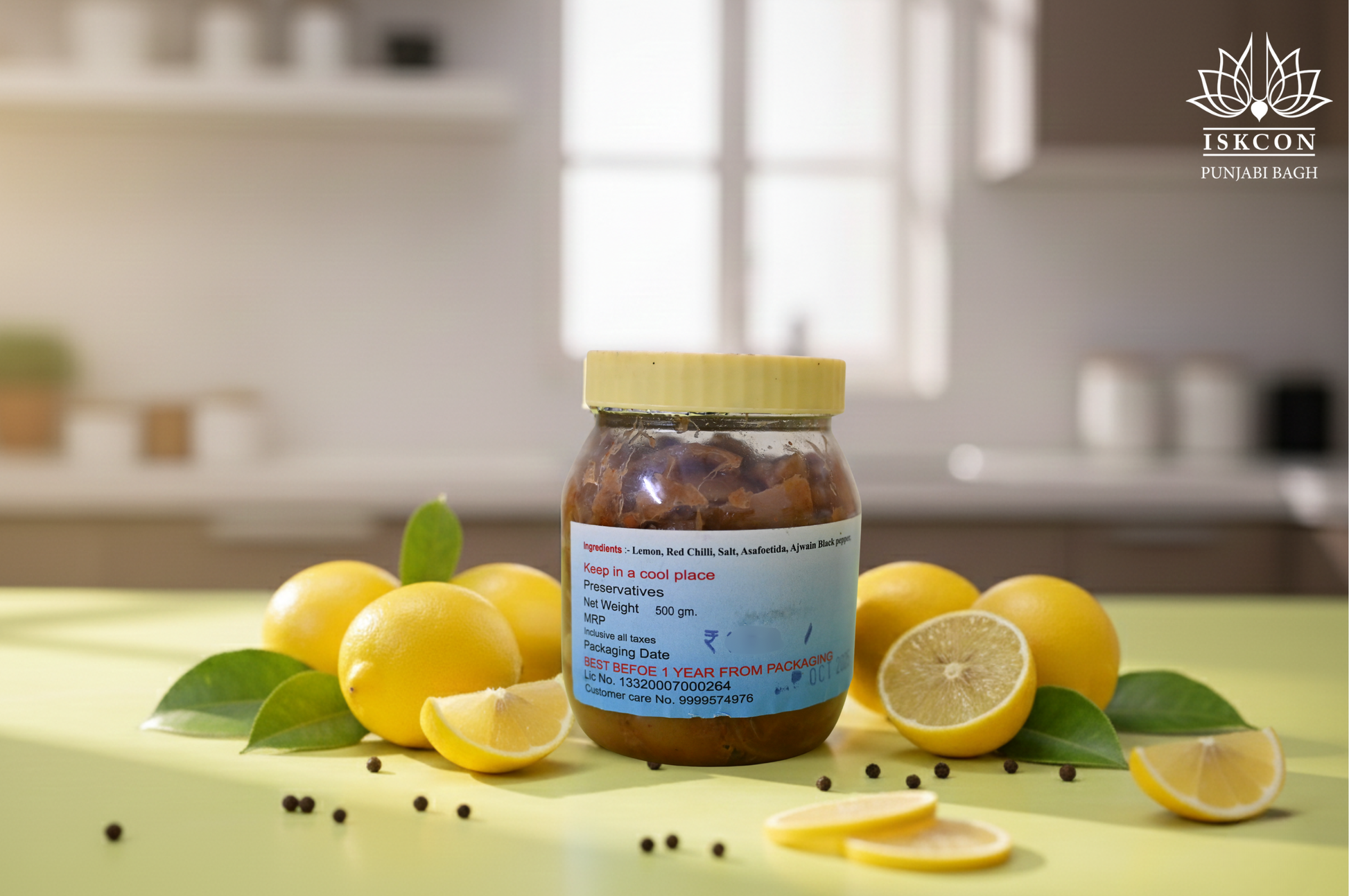 Homemade from fresh lemons by devotees following traditional methods. Refreshing sour taste with long shelf life when stored properly.